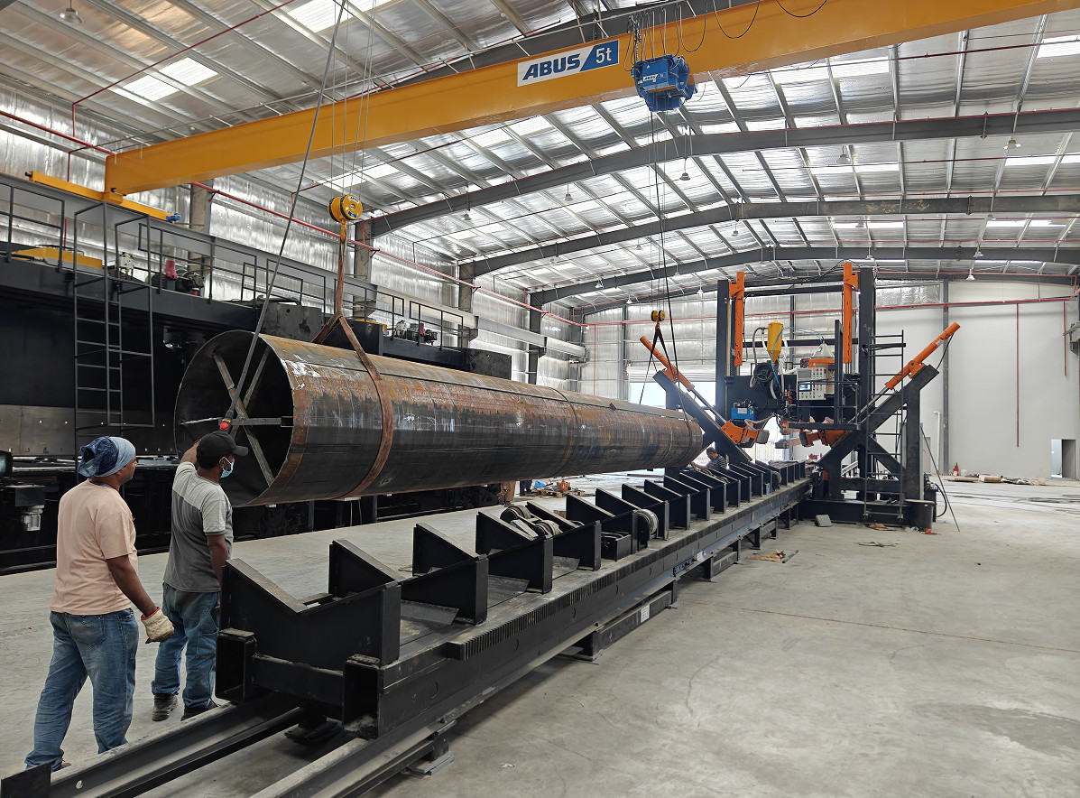 HIGHMAST POLE và MONOPOLE SHUT-WELDING MACHINE, nó phù hợp cho một vỏ hoặc hai vỏ loại đa giác và vòng tròn coni trương. nó là dây chuyền hàn tự động,cấu trúc kiểu gantry được cố định và có hệ thống hàn, trolley chiều dài cột đầy đủ với động cơ SERVO cho tốc độ điều chỉnh di chuyển, Các xi lanh thủy lực đẩy bánh xe kẹp để đóng cột và làm hàn cùng một lúc.