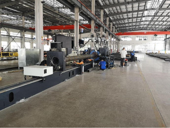 Đầu tiên, đường nối chu vi bên trong và bên ngoài của tấm đế cột được hàn, sau đó sườn gia cố của tấm đế được hàn tự động